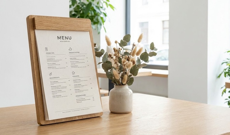 Ngoài yếu tố thiết kế, chất liệu in menu cũng ngày càng được chú trọng. Các chất liệu thân thiện môi trường như giấy mỹ thuật, giấy kraft, gỗ hoặc vật liệu tái chế đang trở thành xu hướng, vừa mang lại cảm giác cao cấp vừa tạo thiện cảm với khách hàng. Tuy nhiên, việc lựa chọn chất liệu vẫn cần phù hợp với mô hình kinh doanh. Với quán ăn đông khách, menu nhựa chống nước vẫn là lựa chọn tối ưu về độ bền. Trong khi đó, các nhà hàng cao cấp có thể ưu tiên menu bìa da hoặc bìa cứng để nâng tầm thương hiệu.
